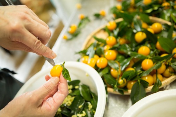 (写真は金柑の実に切れ目を入れ金柑の種を取り除く作業の一部です)